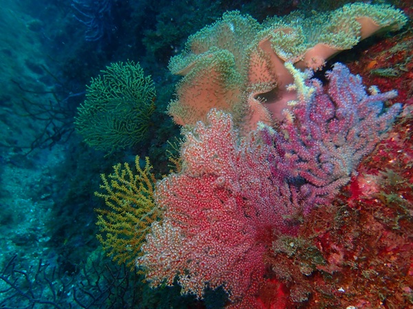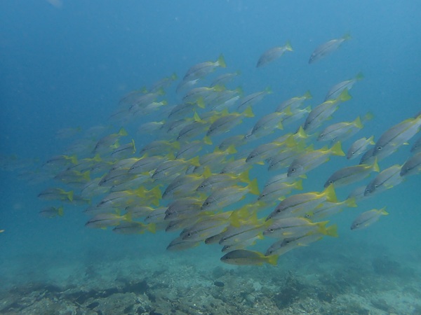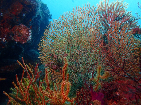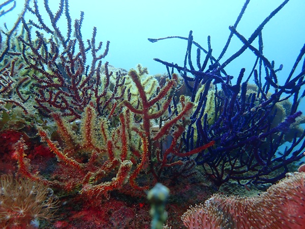 南国を感じるヨコスジフエダイの群れが大きくなってきています。ソフトコーラルはライトを照らすと本来の色がでるので綺麗な景観が楽しめています。
