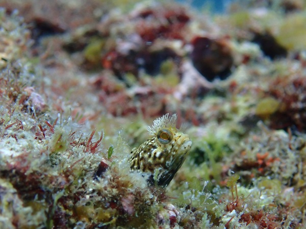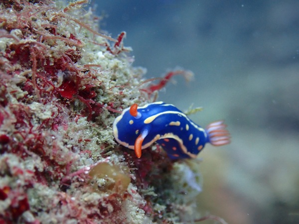ウミウシの種類が多くなる季節ですが普通種のアオウミウシやニシキウミウシは個体数が多く見つけやすいです。安全停止中はコケギンポ団地になっていて良い被写体になってくれています。