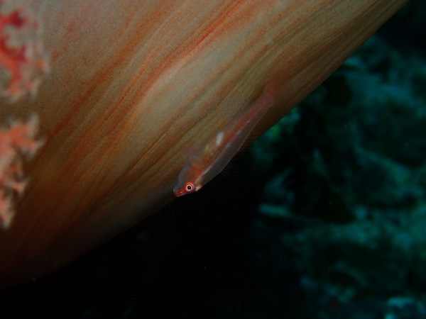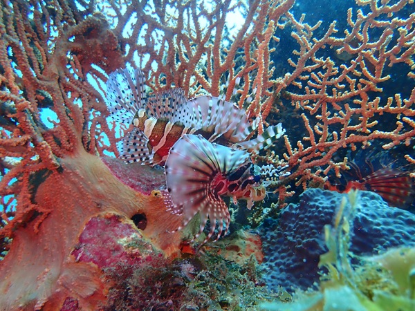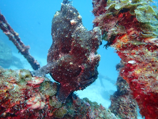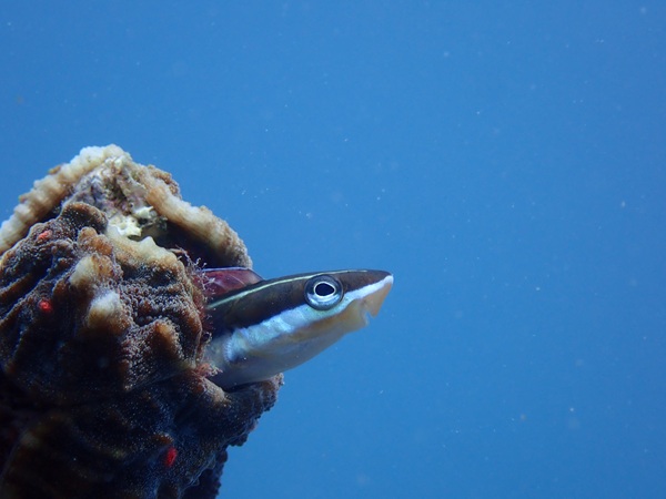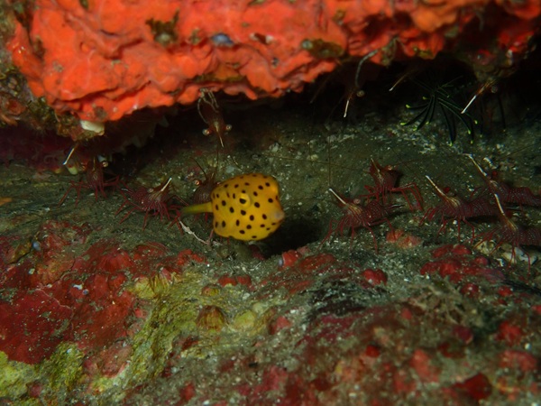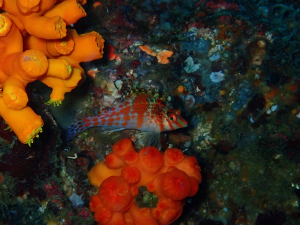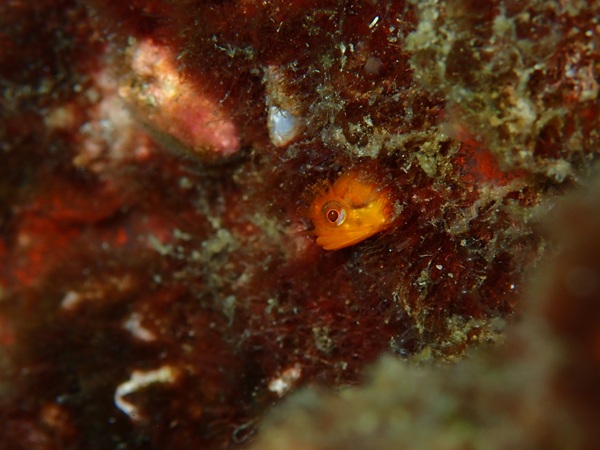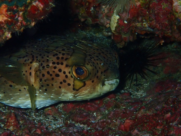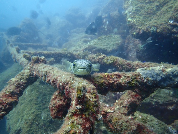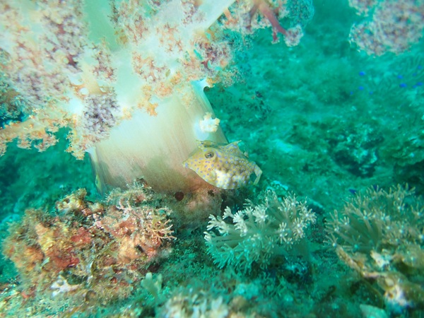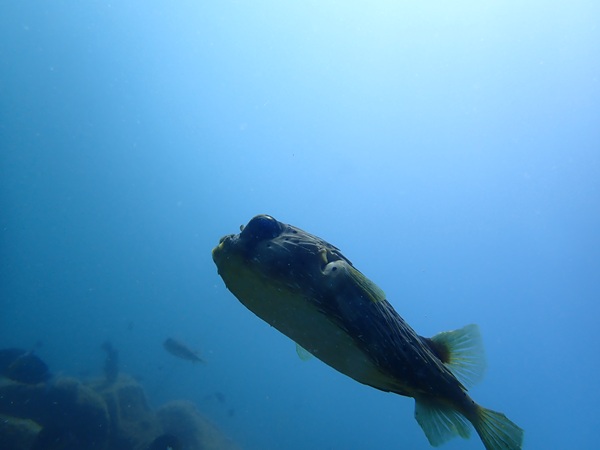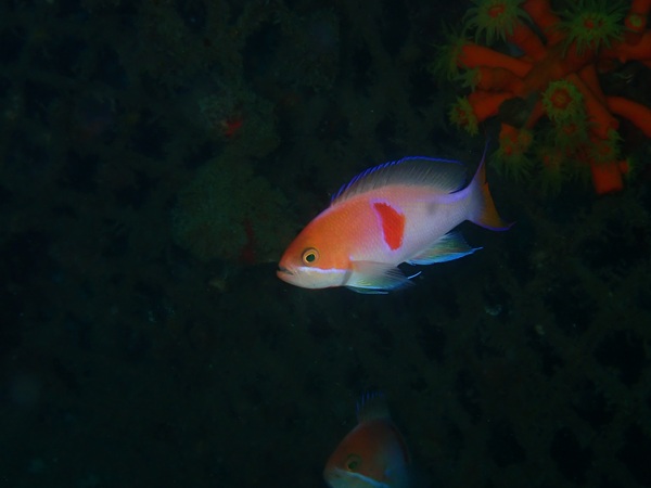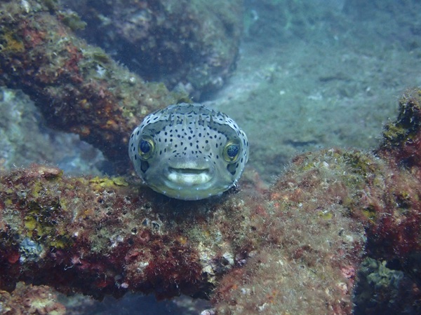 オオモンカエルアンコウは仏頂面ですがハリセンボンは愛嬌たっぷりでこちらをいつも見ています。ライトを当てるとアカオビハナダイの婚姻色が綺麗に見られます。