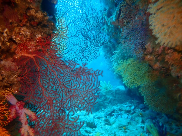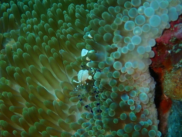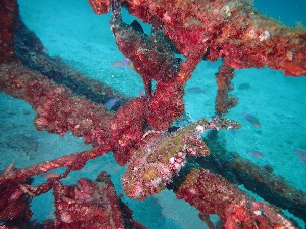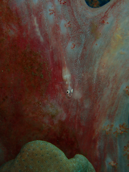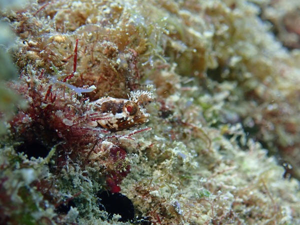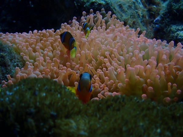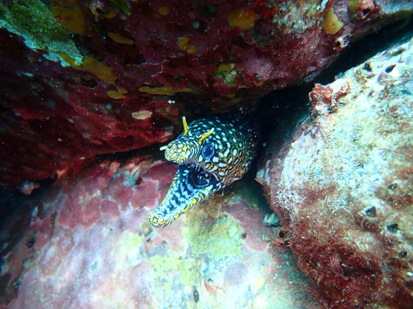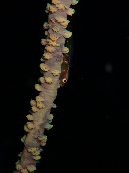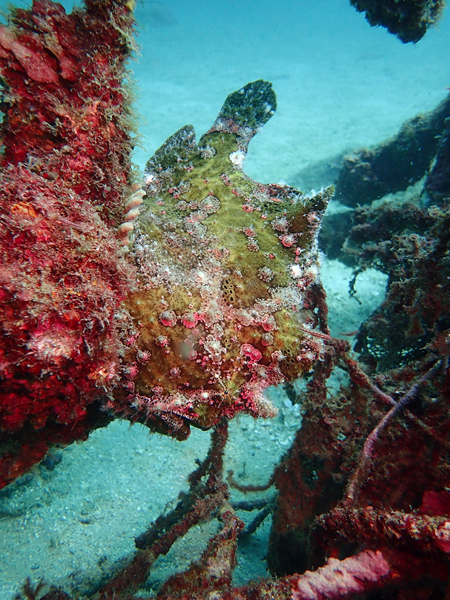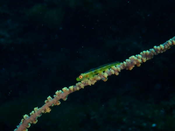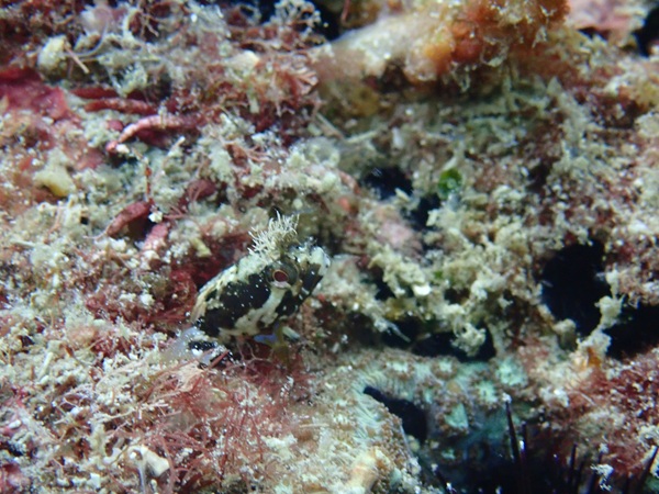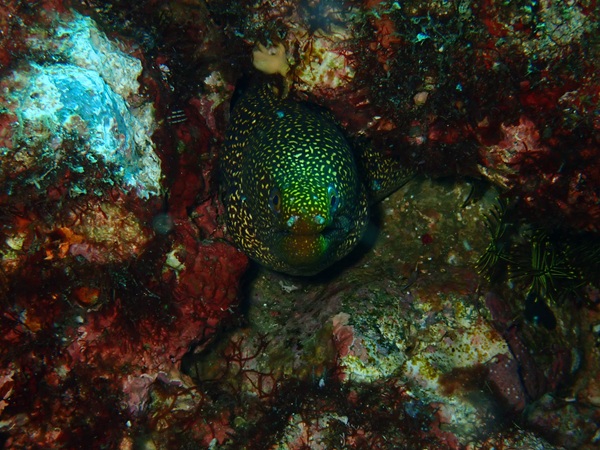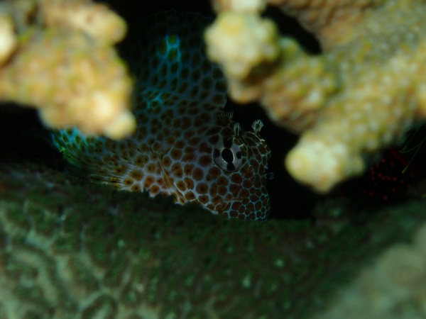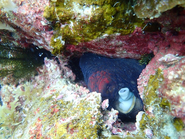 オオモンカエルアンコウは仏頂面ですがハリセンボンは愛嬌たっぷりでこちらをいつも見ています。ライトを当てるとアカオビハナダイの婚姻色が綺麗に見られます。