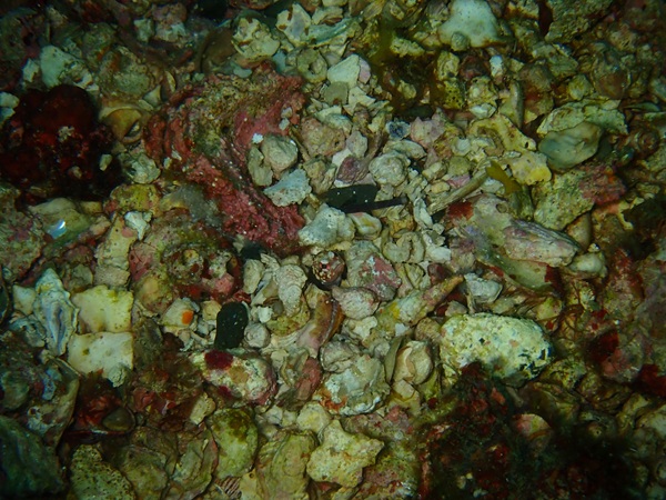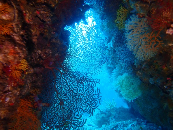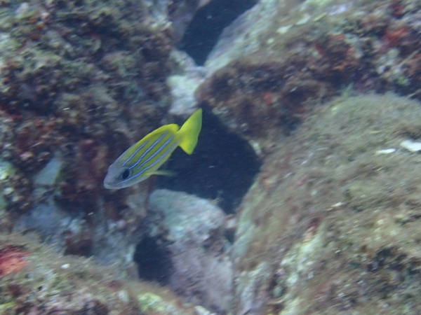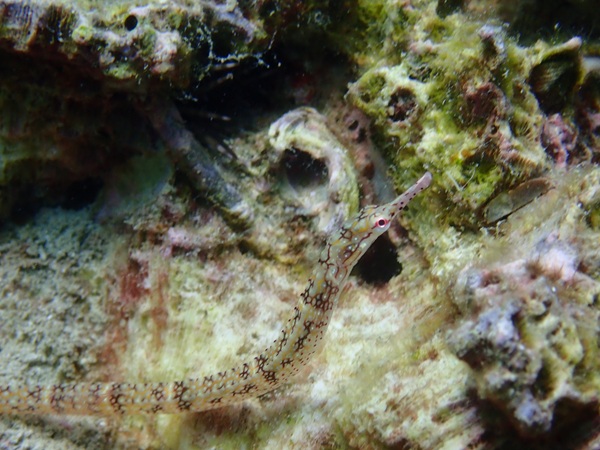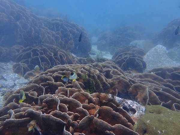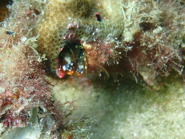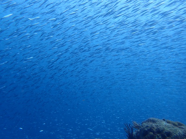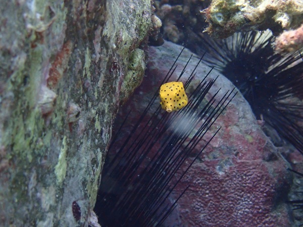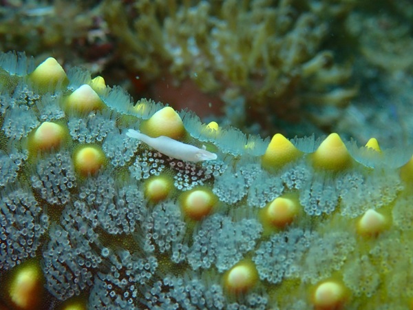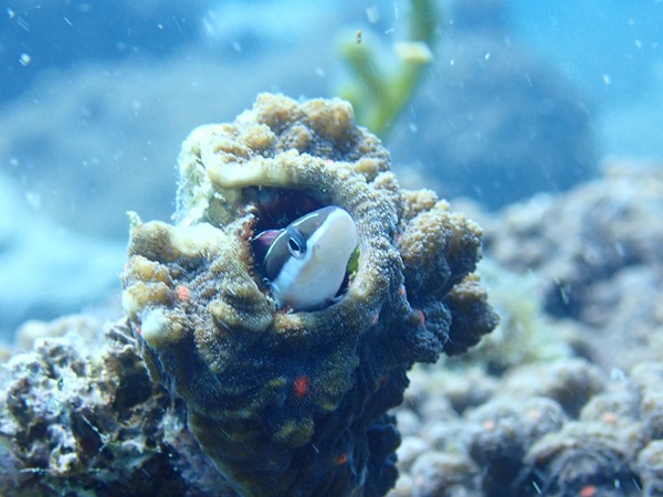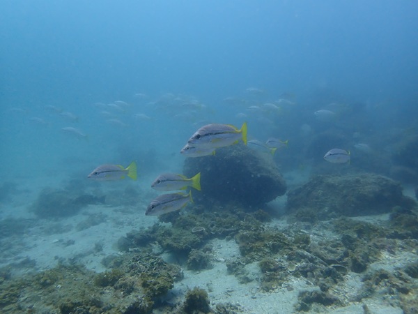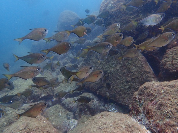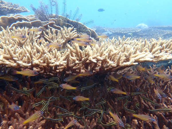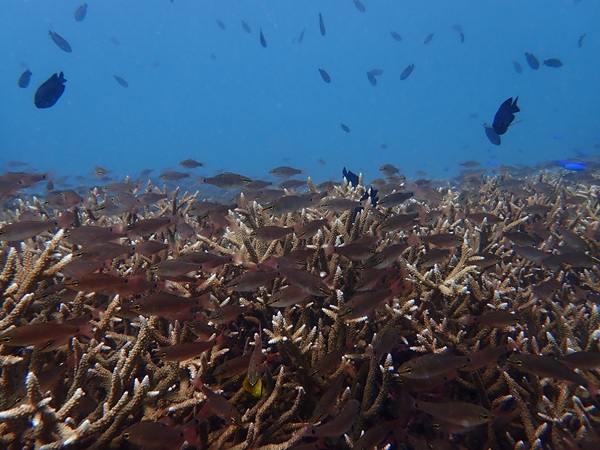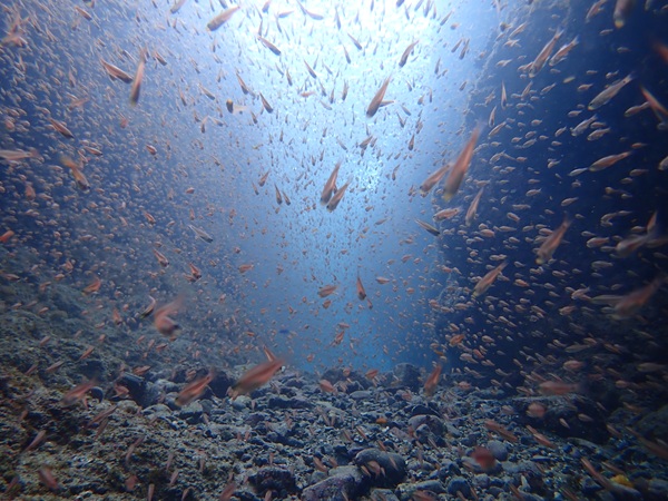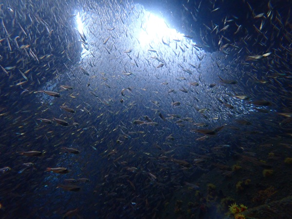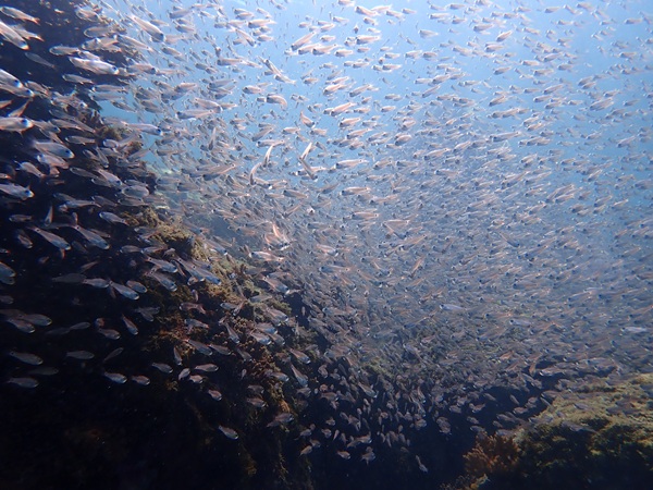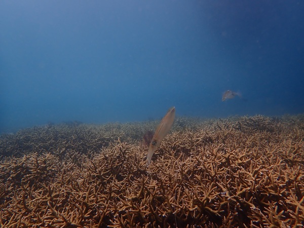 ヒラバエセノーテの中はクロホシイシモチの幼魚の群れとキンメモドキで埋め尽くされていました。ここまで群れると太陽光が入ってこなかったですが面白かったです。大潮周りという事で色々生物が産卵していますがアオリイカの産卵がまだエダサンゴ群で見られました。