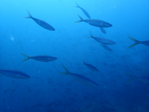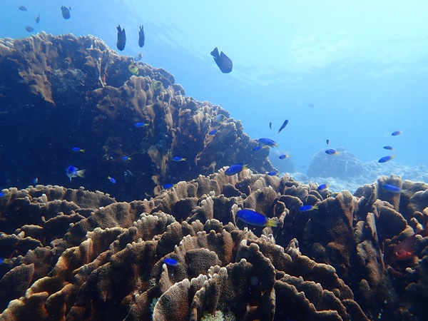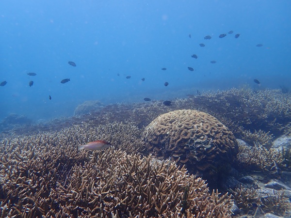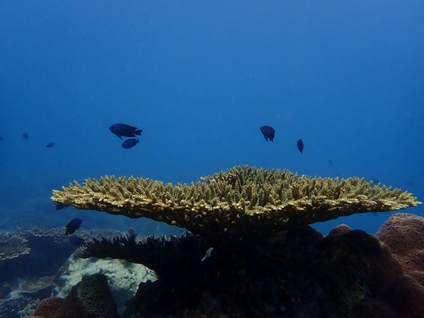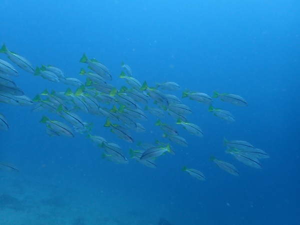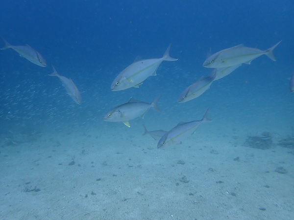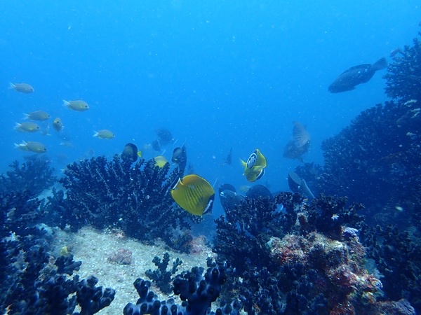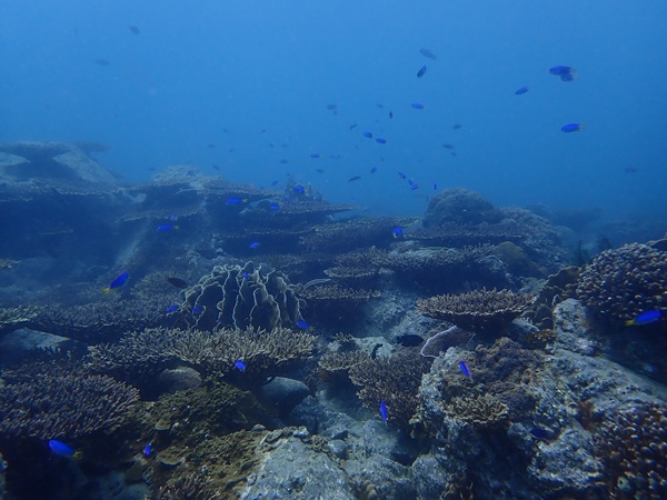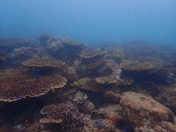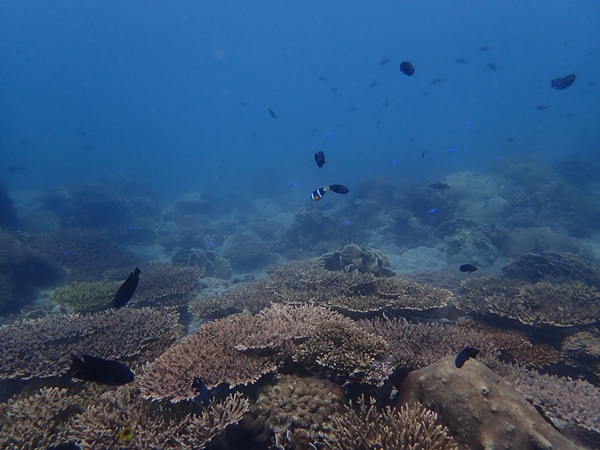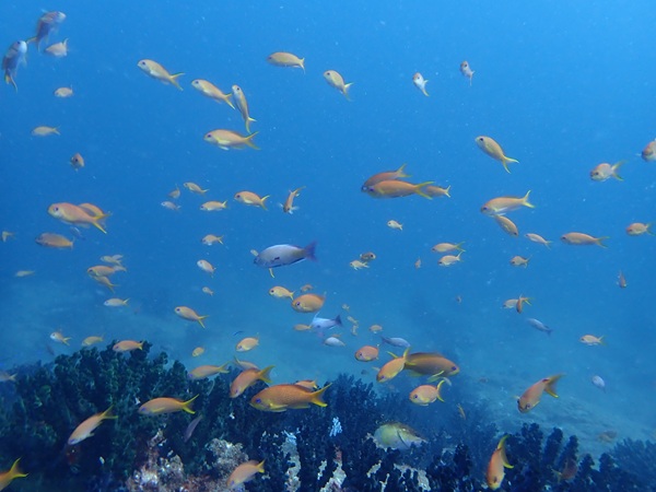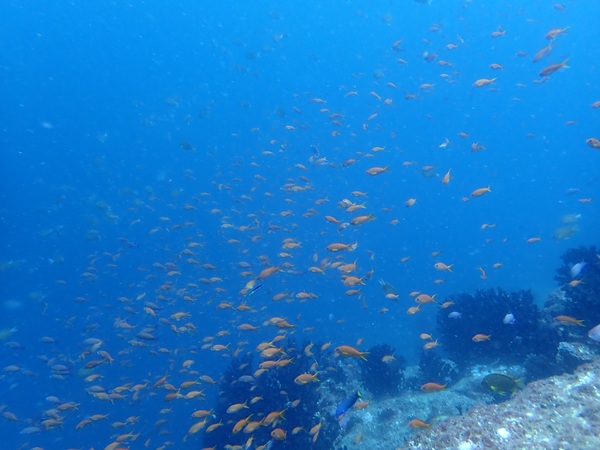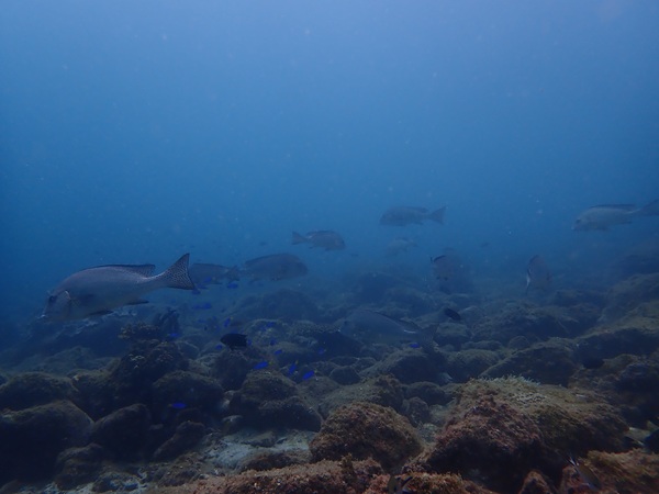 本日の天候は晴れ時々曇りとなりました。海況は北より風波がたちました。透視度は10m前後と通常時で水温は25度以上と高めです。