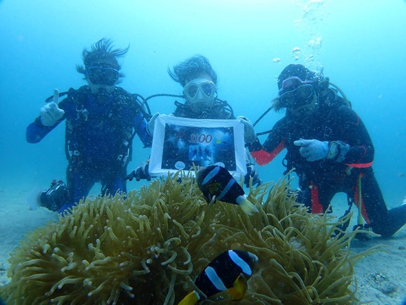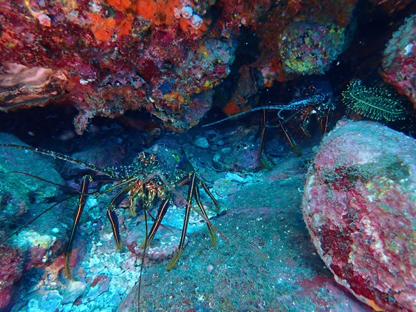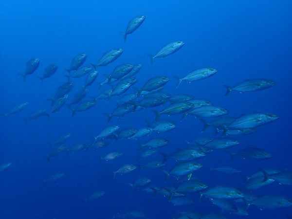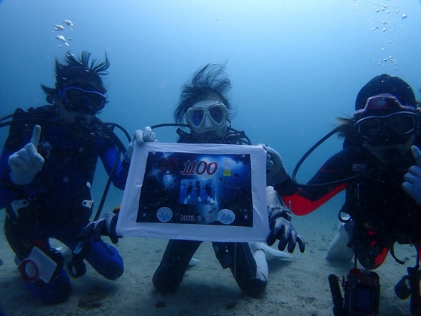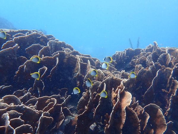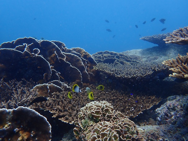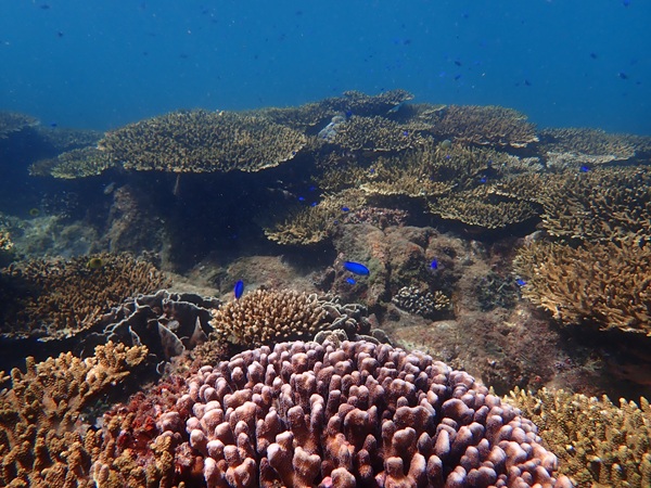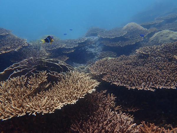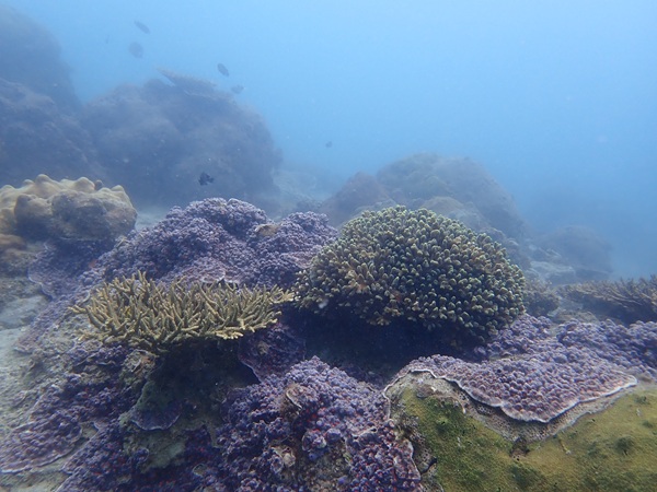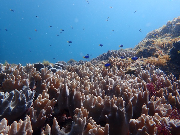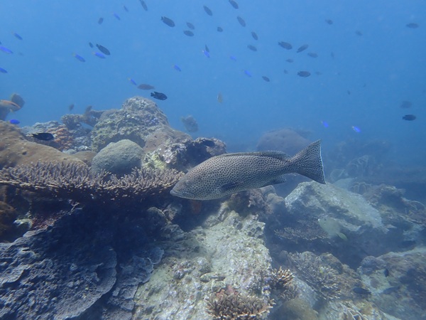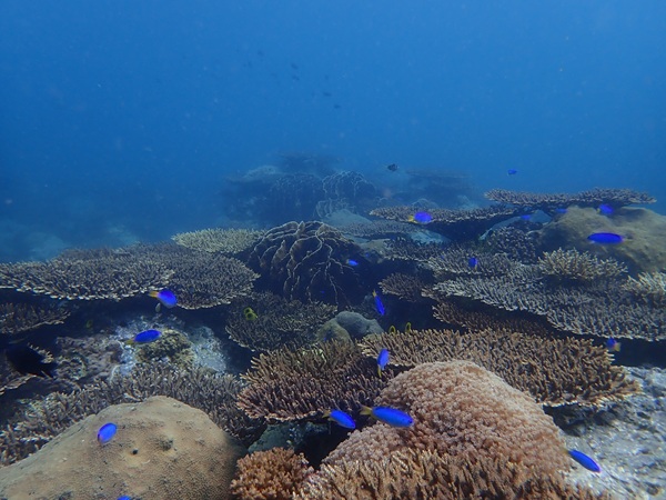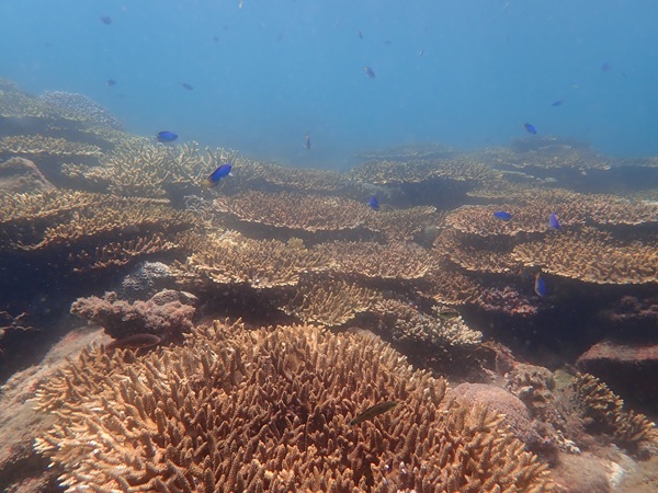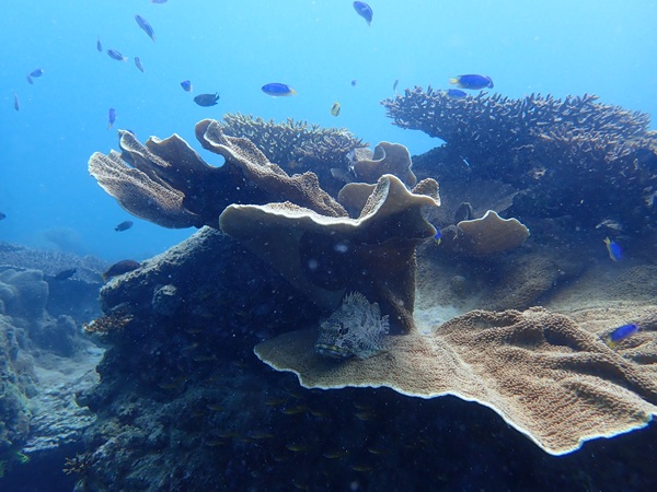 本日の天候は晴れ時々曇りとなりました。海況は北より風波がたちました。透視度は10m前後と通常時で水温は25度以上と高めです。